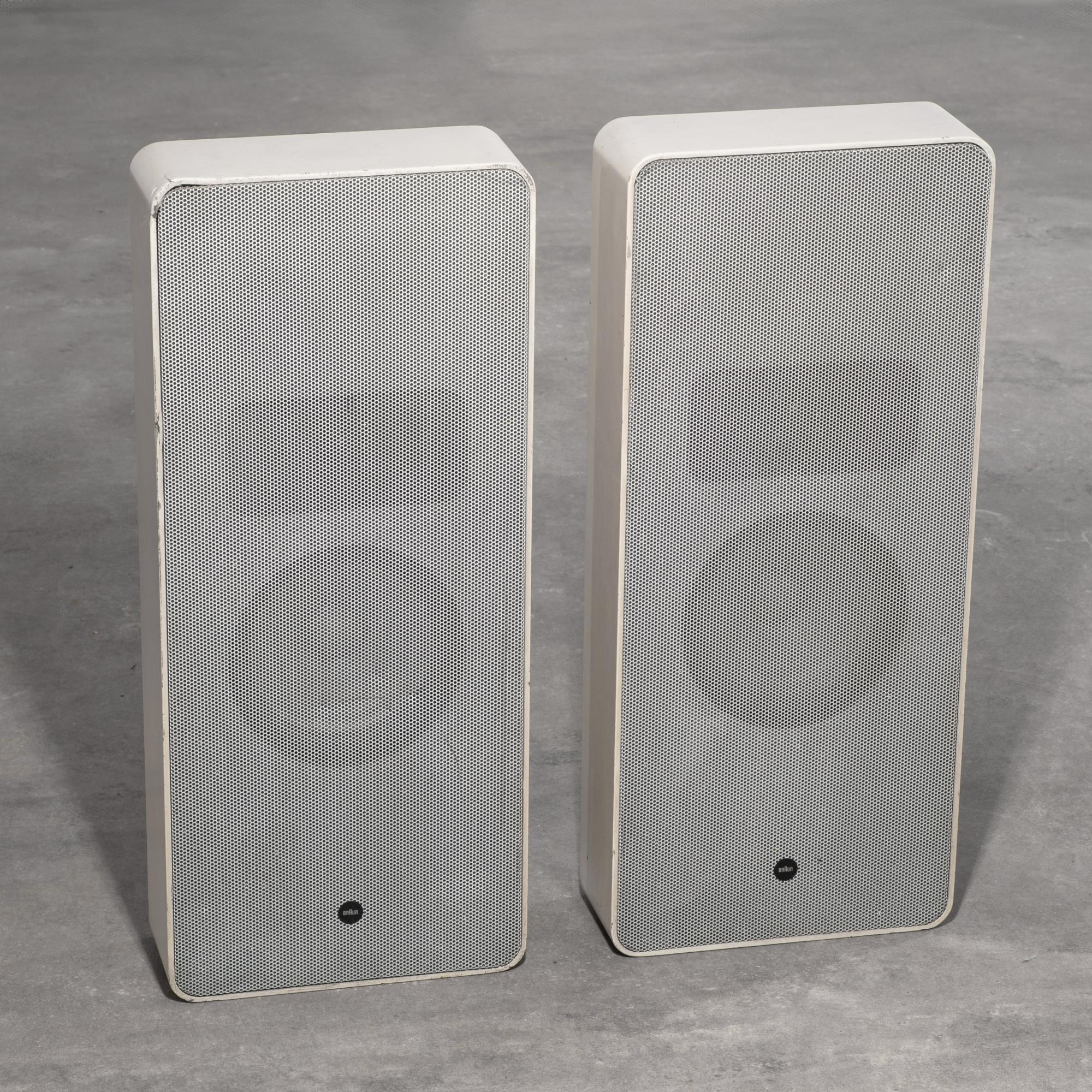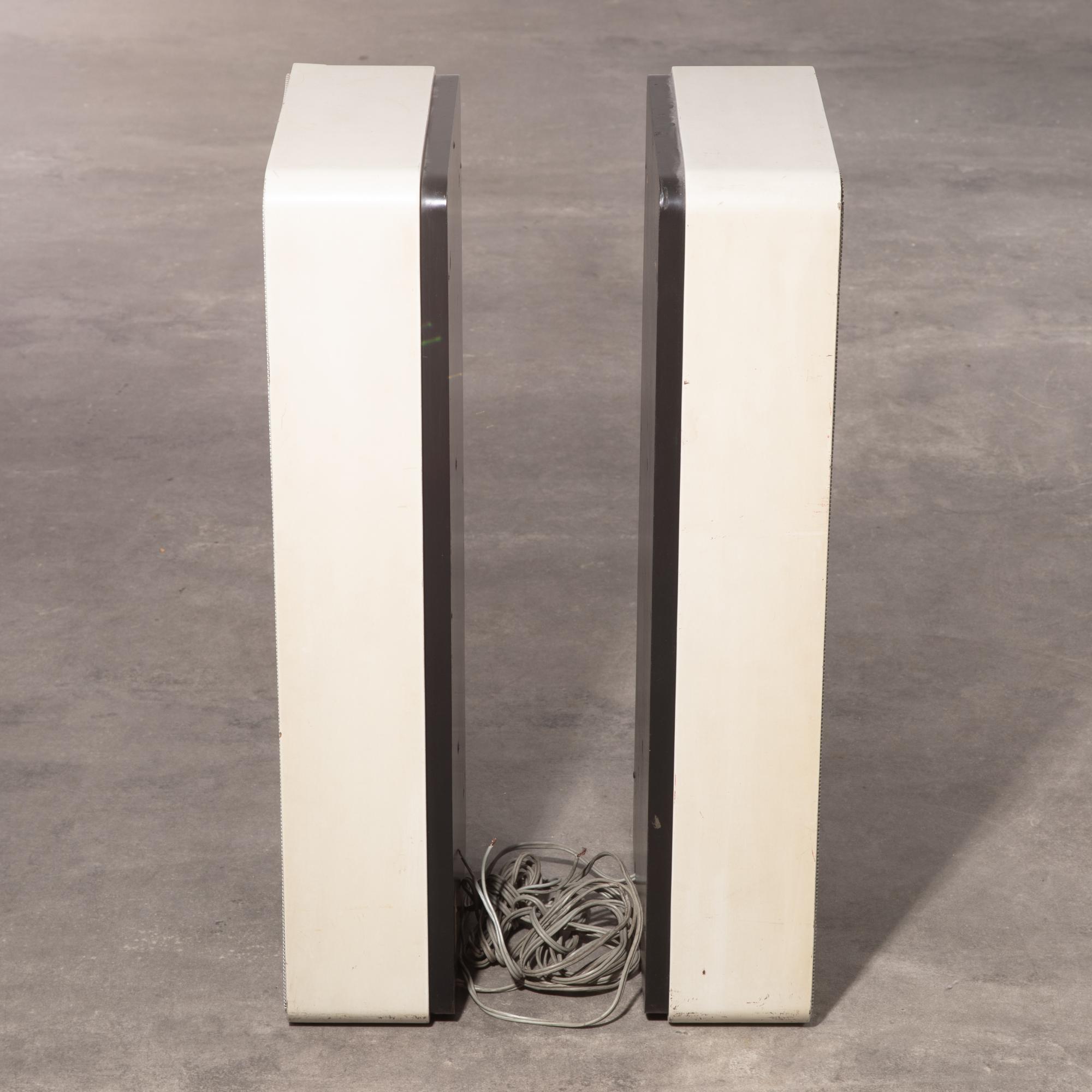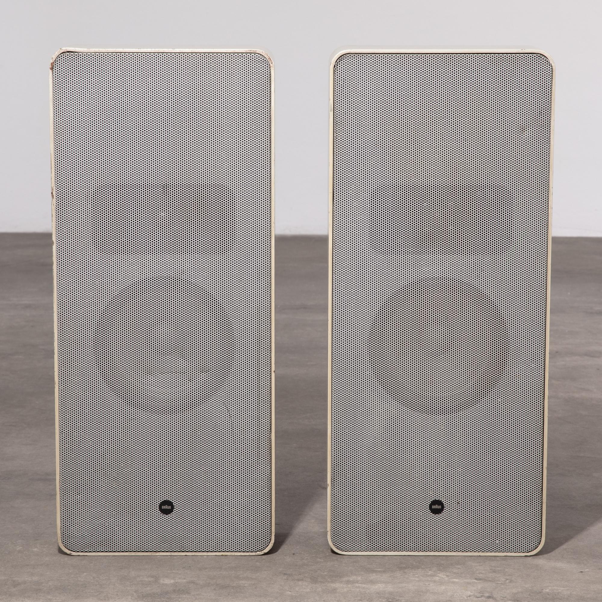 Signs of wear commensurate with age. The cabinet has chipped edges and dents in the perforated metal. Functionality has been tested, and the sound of one speaker is better. General functionality cannot be guaranteed.