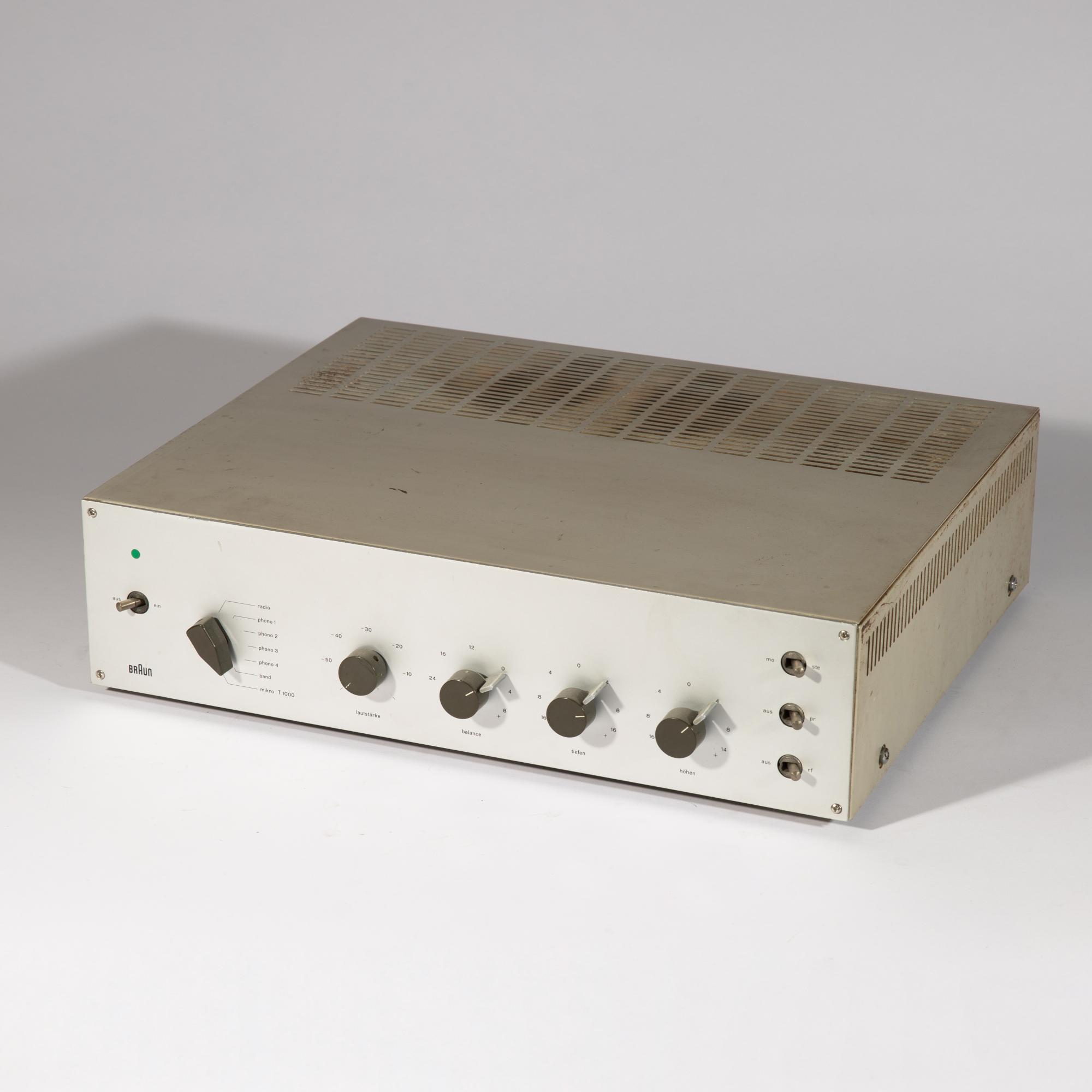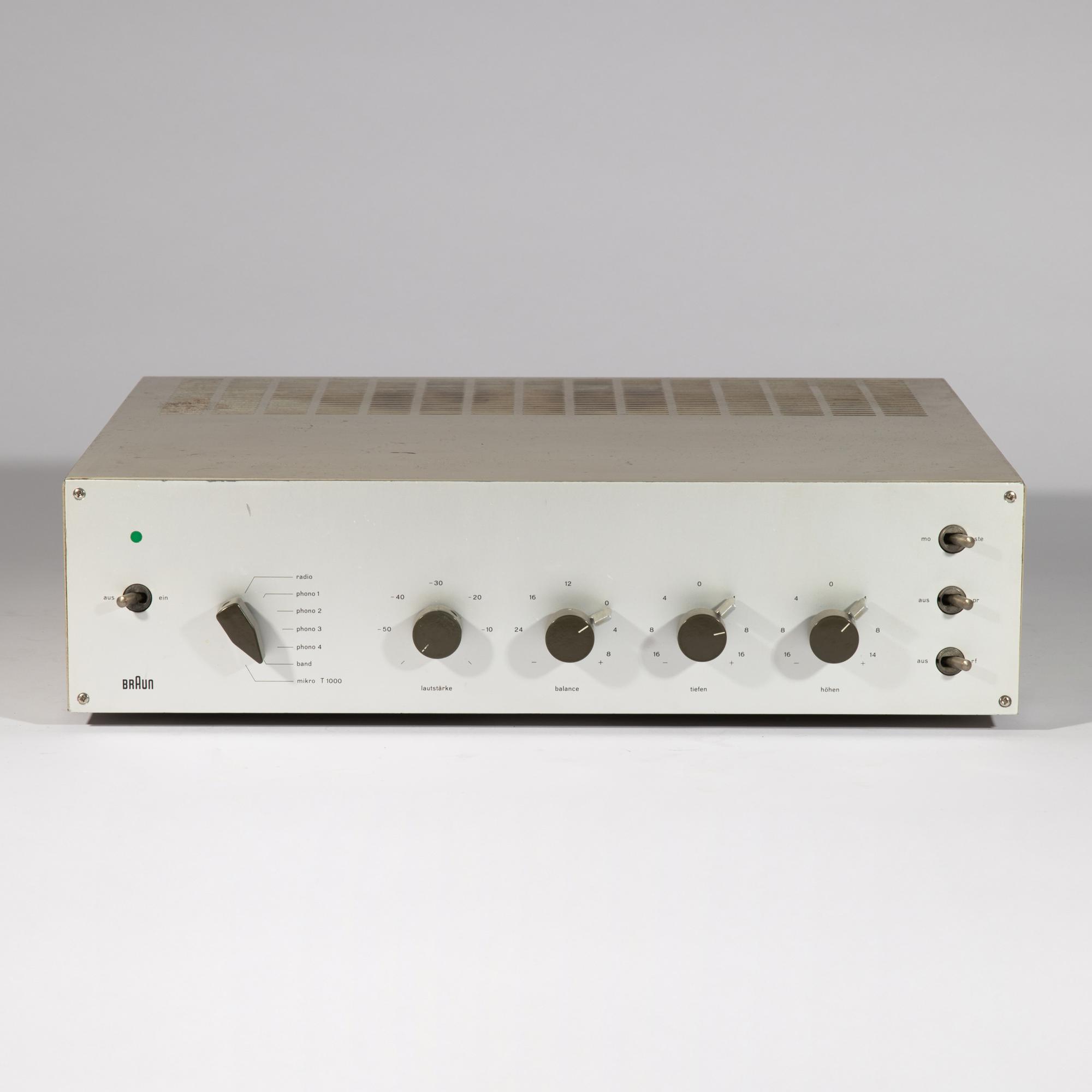 Designed in 1961. Manufactured by Braun AG. Light gray lacquered metal, aluminum front, plastic. 11 x 40 x 32 cm. Marked.