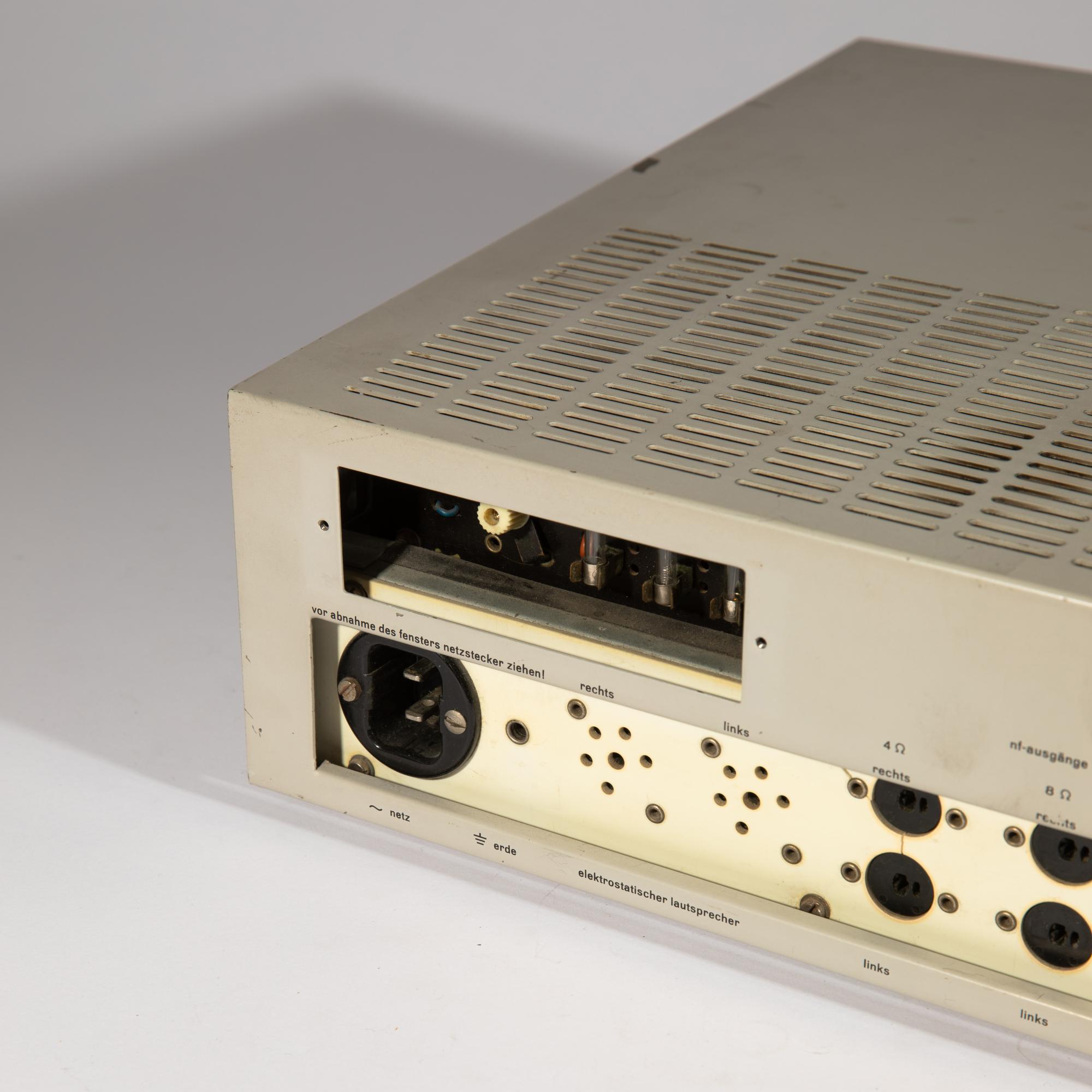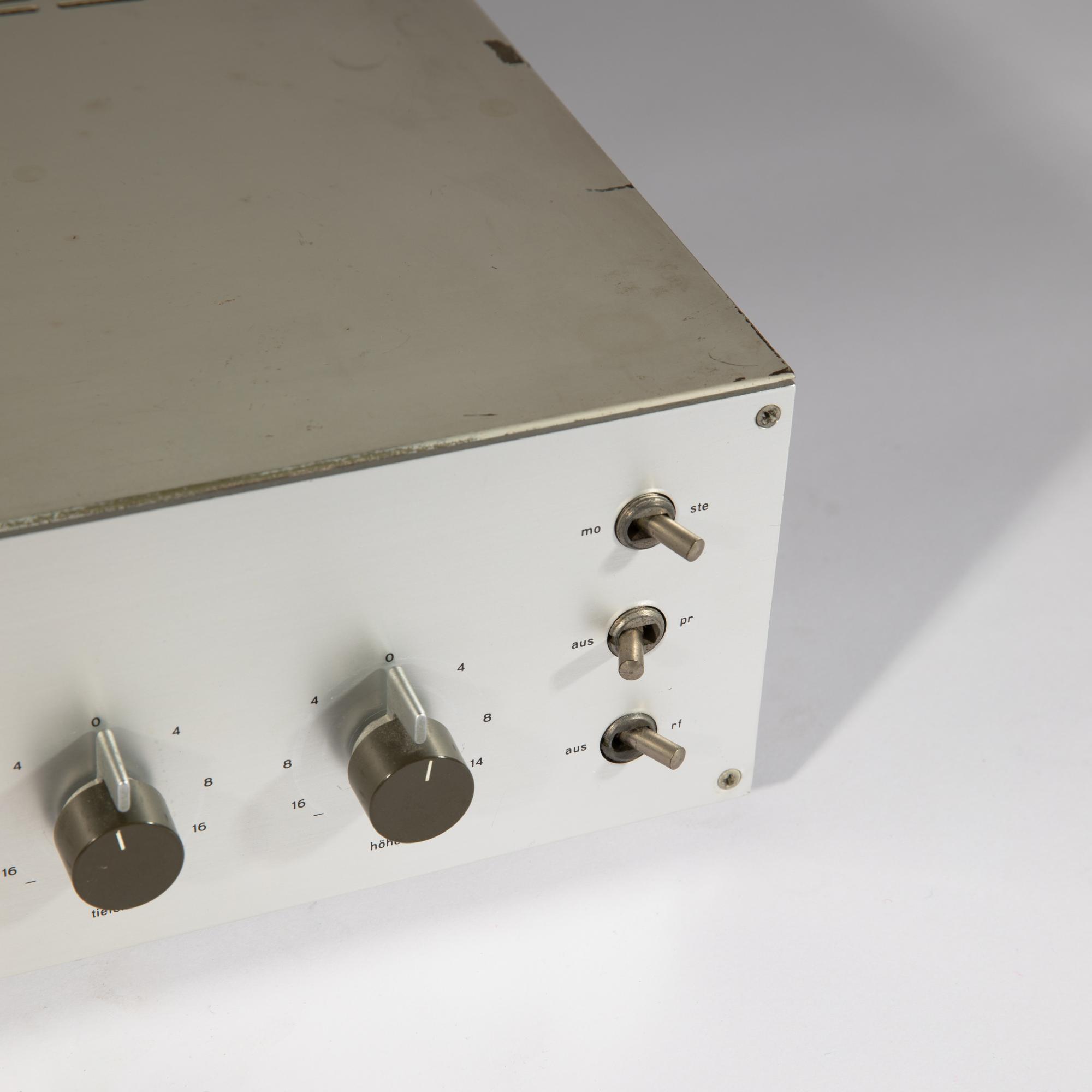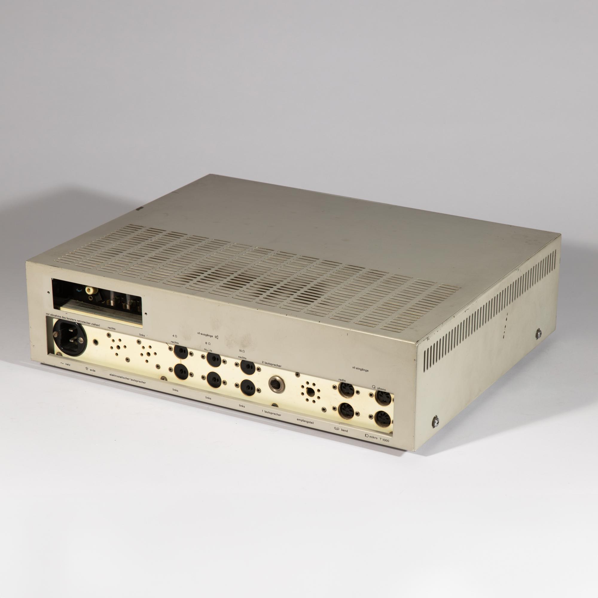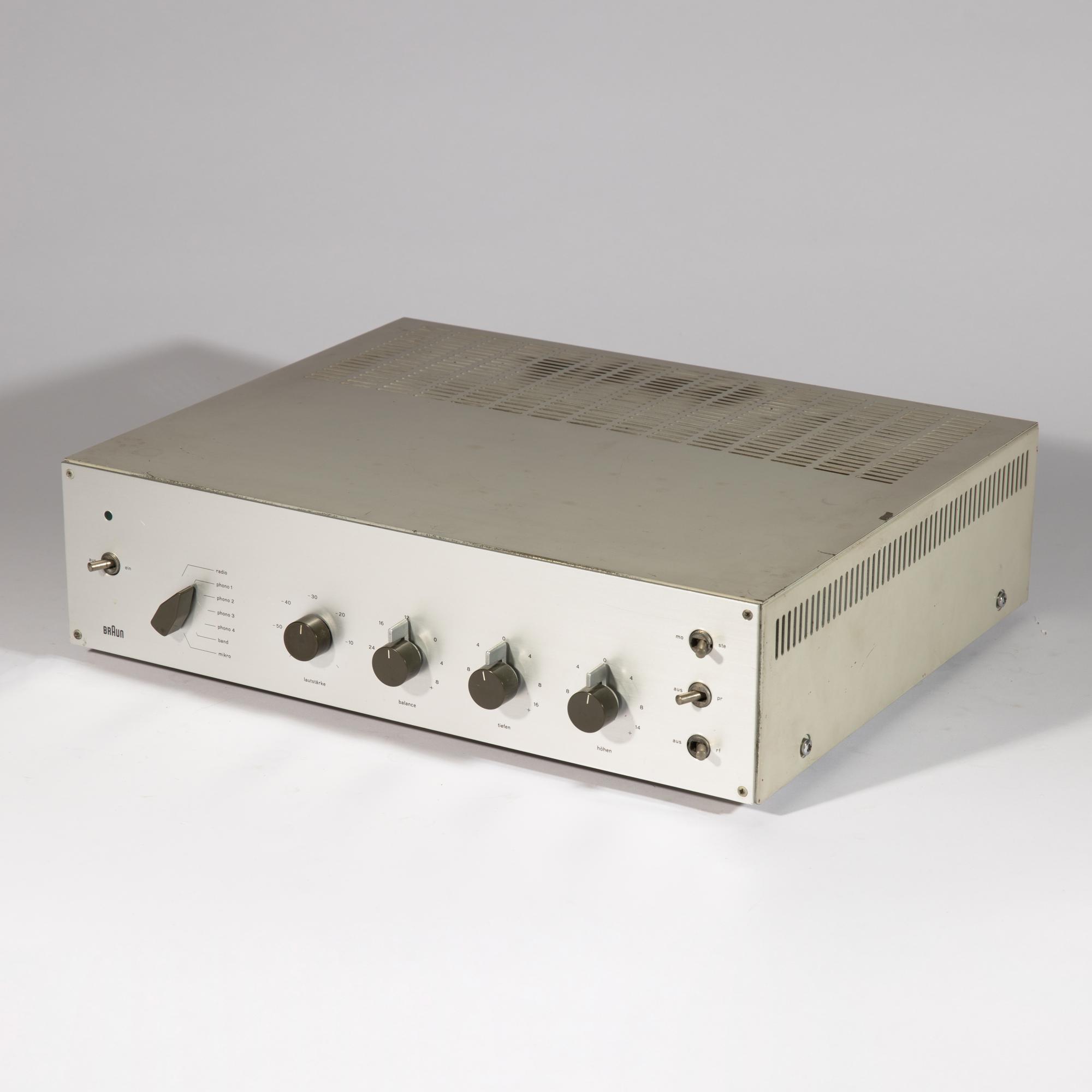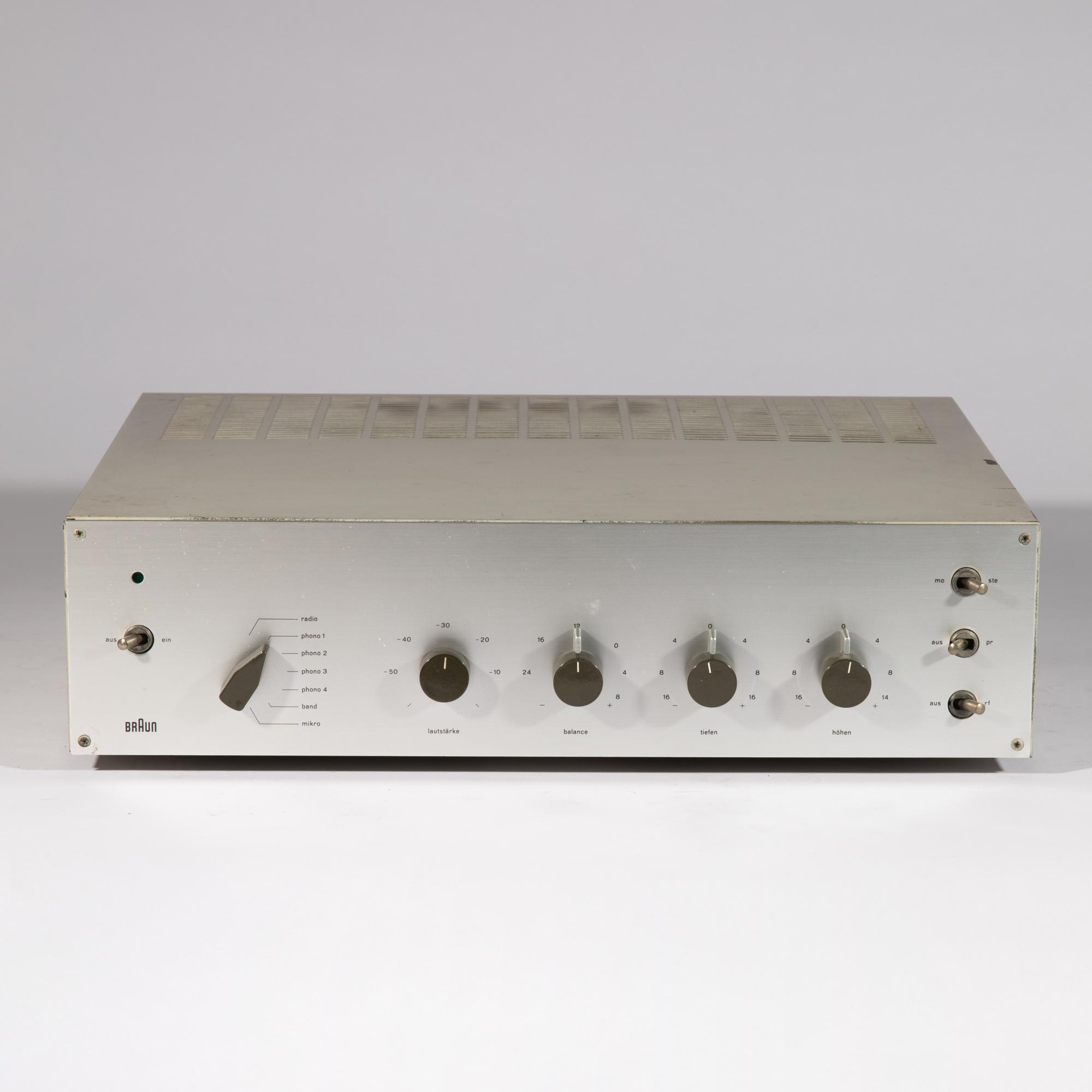 Designed in 1962. Manufactured by Braun AG. Light gray lacquered metal, aluminum front, plastic. 11 x 40 x 32 cm. Marked