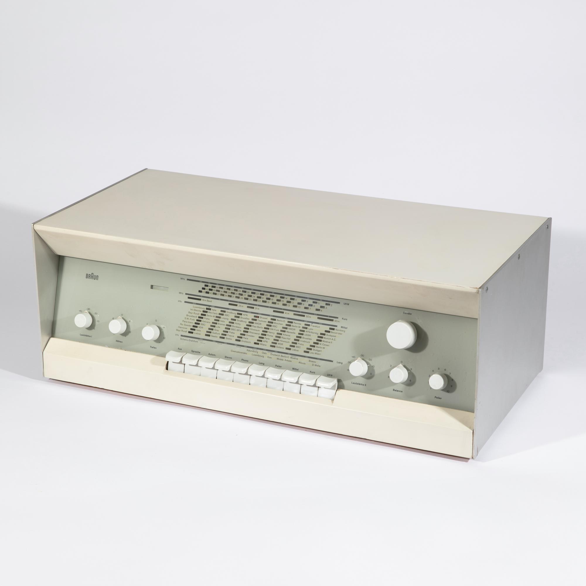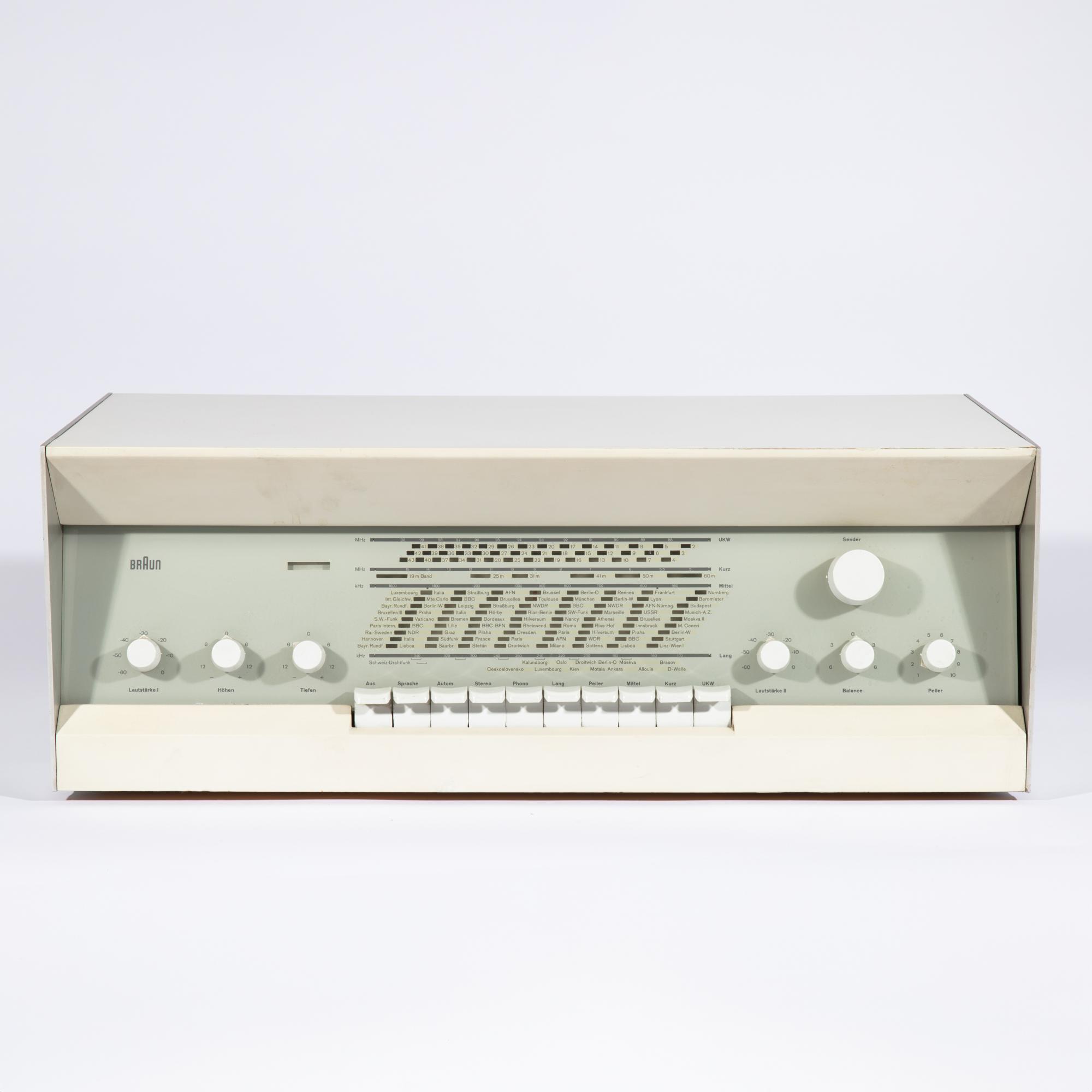 Designed in 1961. Manufactured by Braun AG. Aluminum, white lacquered wood, acrylic. 20.5 x 56.5 x 29 cm. Signed several times.