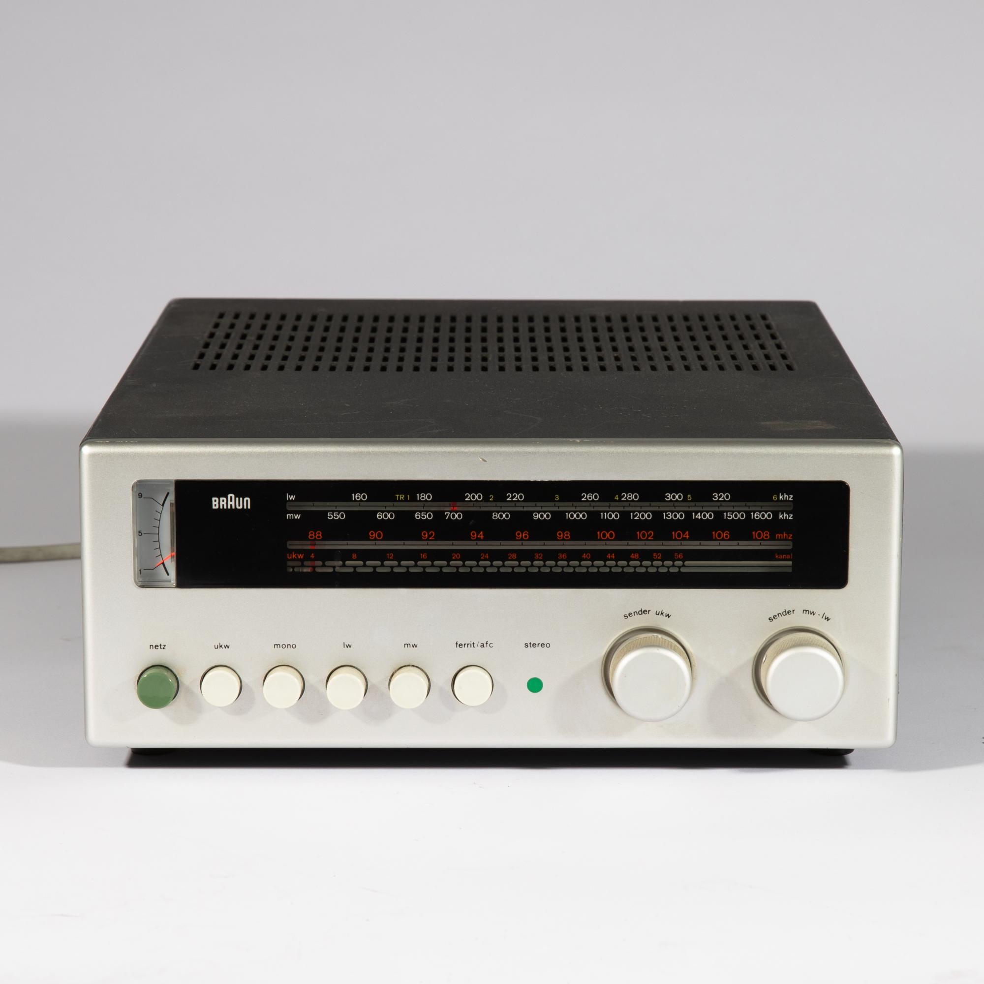 Designed in 1969. Manufactured by Braun AG. Metal with shrink-wrap finish, aluminum front, and plastic. 11 x 26 x 32 cm. Marked.