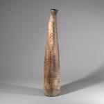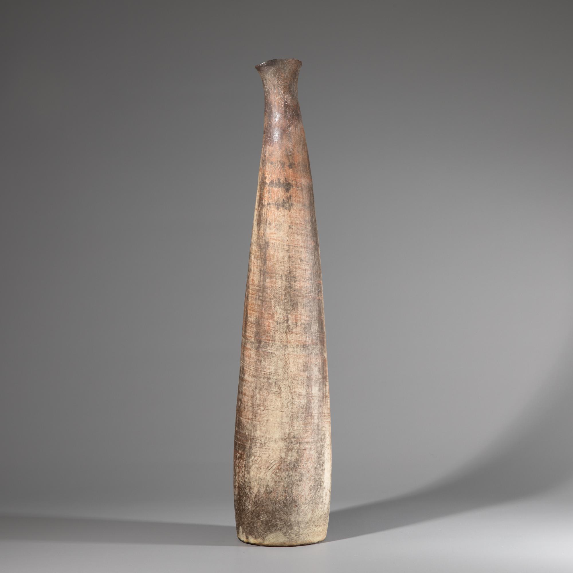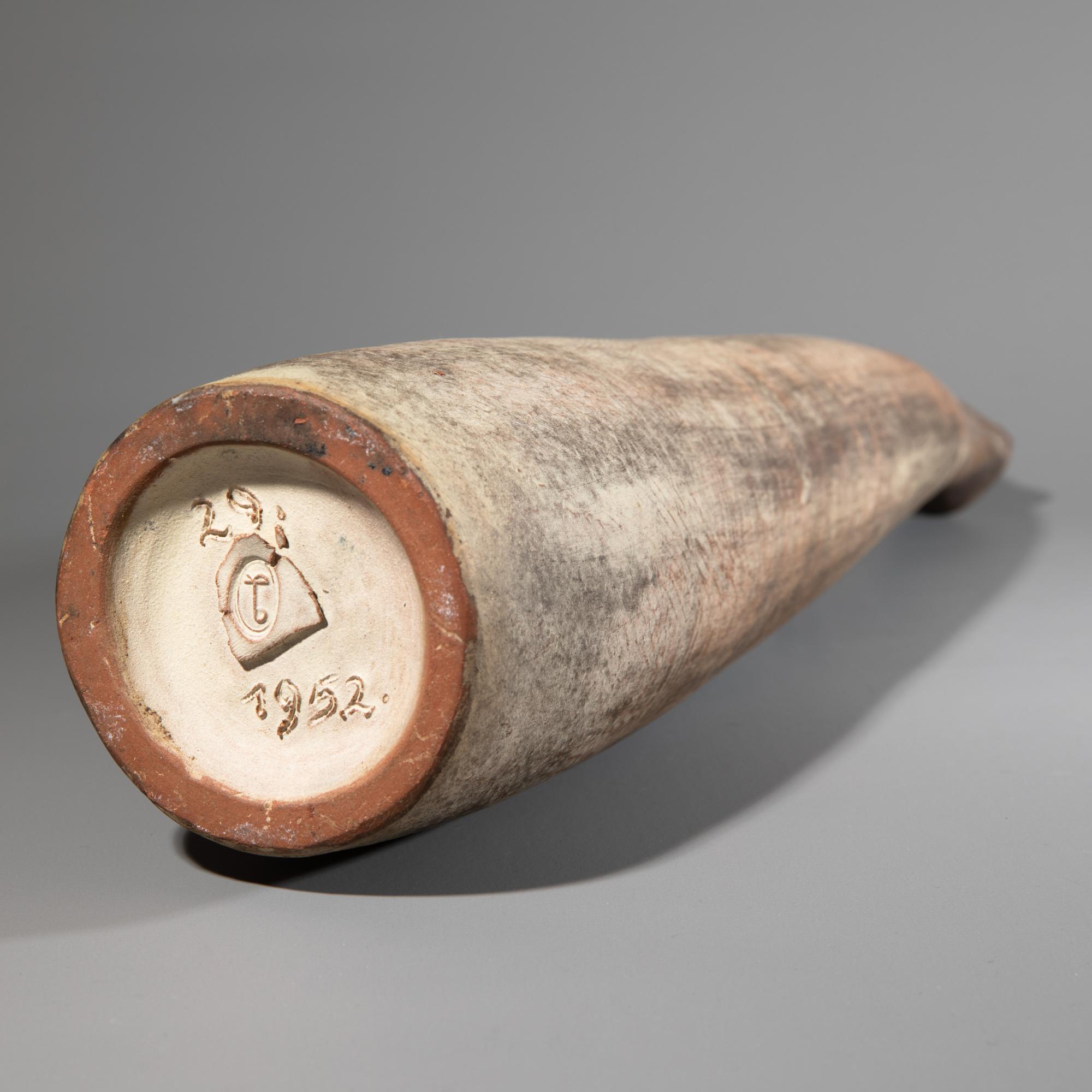 Ceramic, multi-tone brown glaze. Tall, slender, and slightly curved body with a depressed mouth. H. 50 cm, D. 9.2 cm. Marked on the underside with the artist's signet, the date '1952', and the incised inscription '29'.