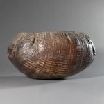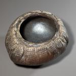Raku ceramic. The rough, matte surface contrasts with the smooth, glossy interior of the bowl. 14 x 27 x 24.5 cm. Inscribed on the side with workshop marks.