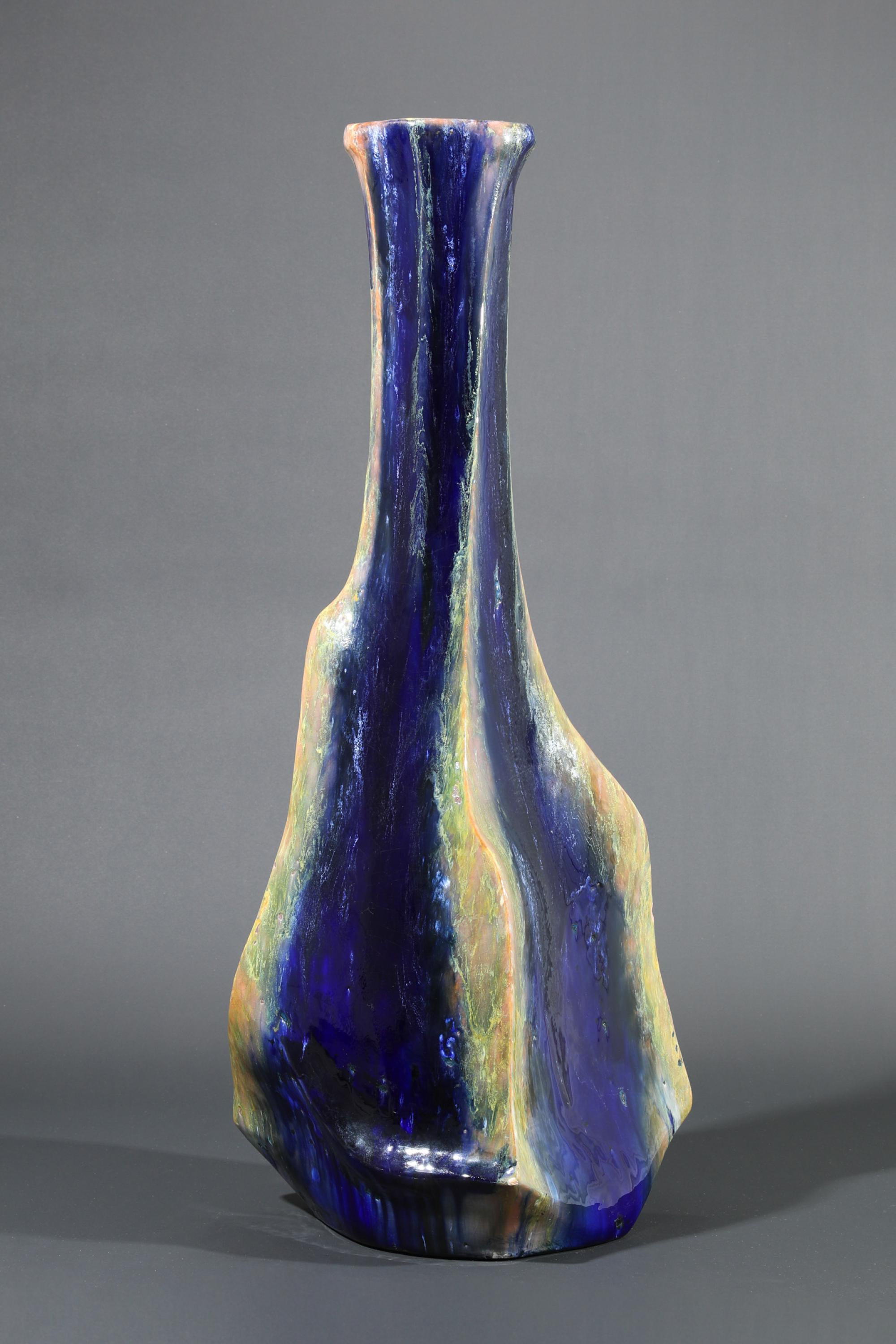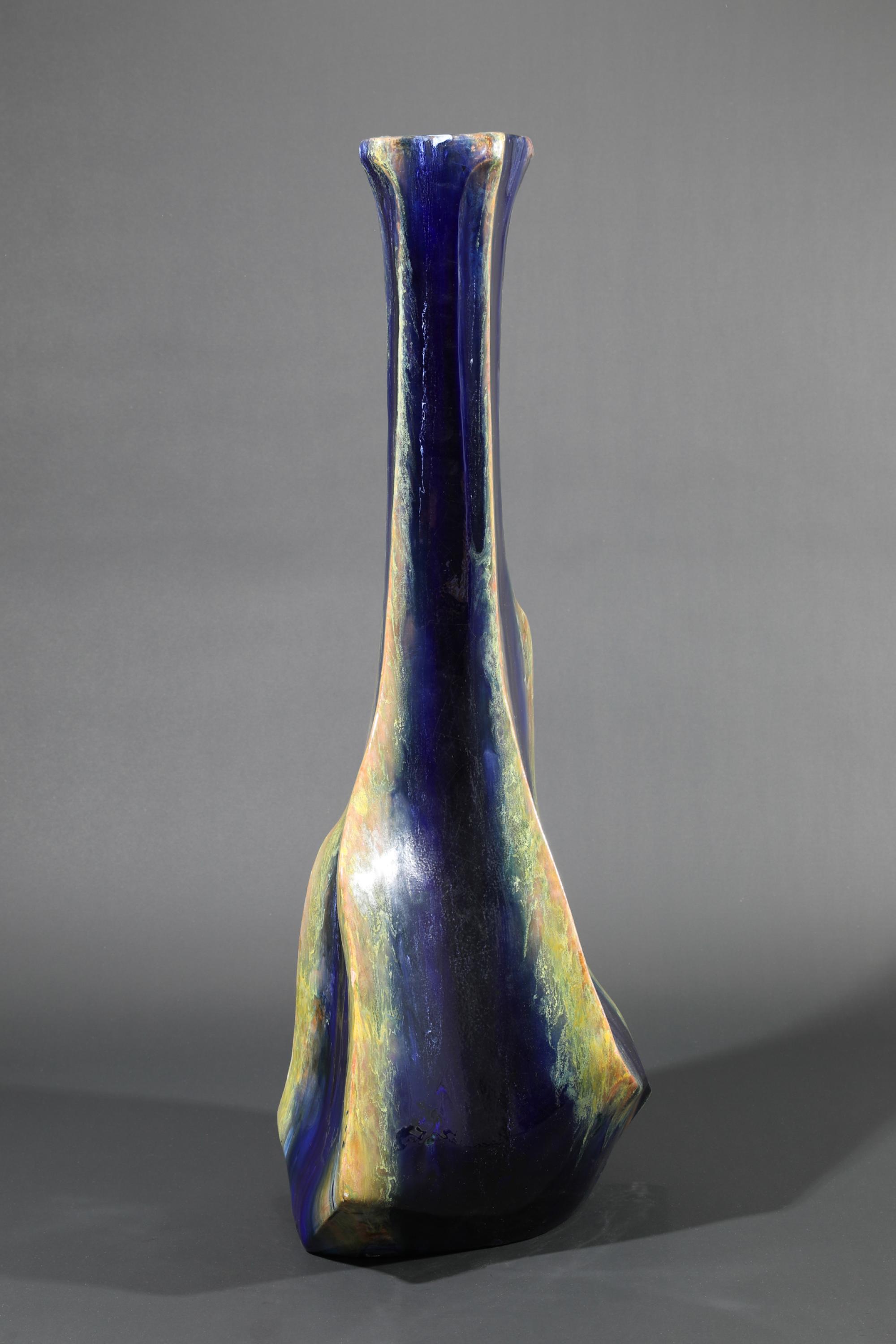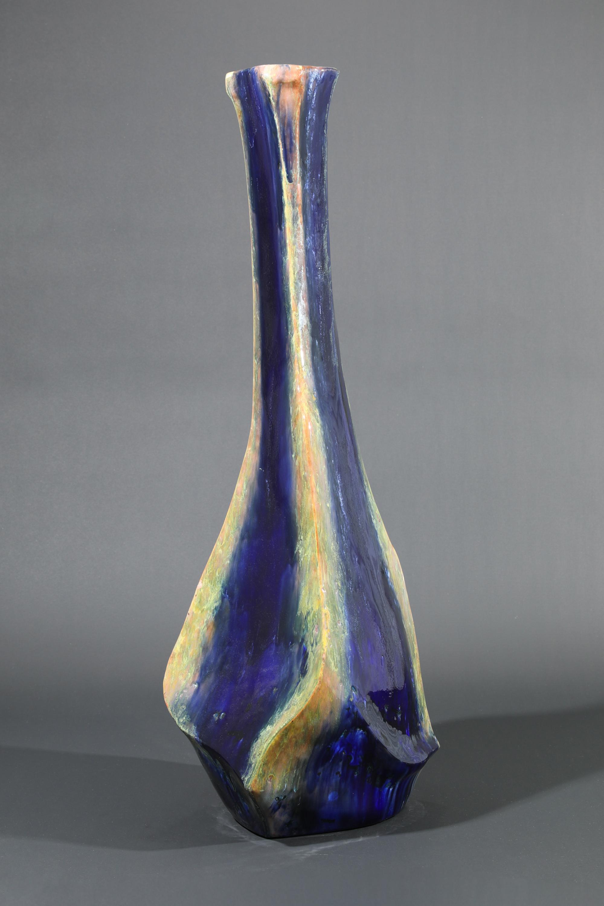 Floor vase. Stoneware. Irregularly four-sided, slightly bulbous form. Dark brown, yellow-green, and ochre-colored flowing glaze, coarse craquelure. H. 85 cm. Signed on the base: Briosco.