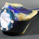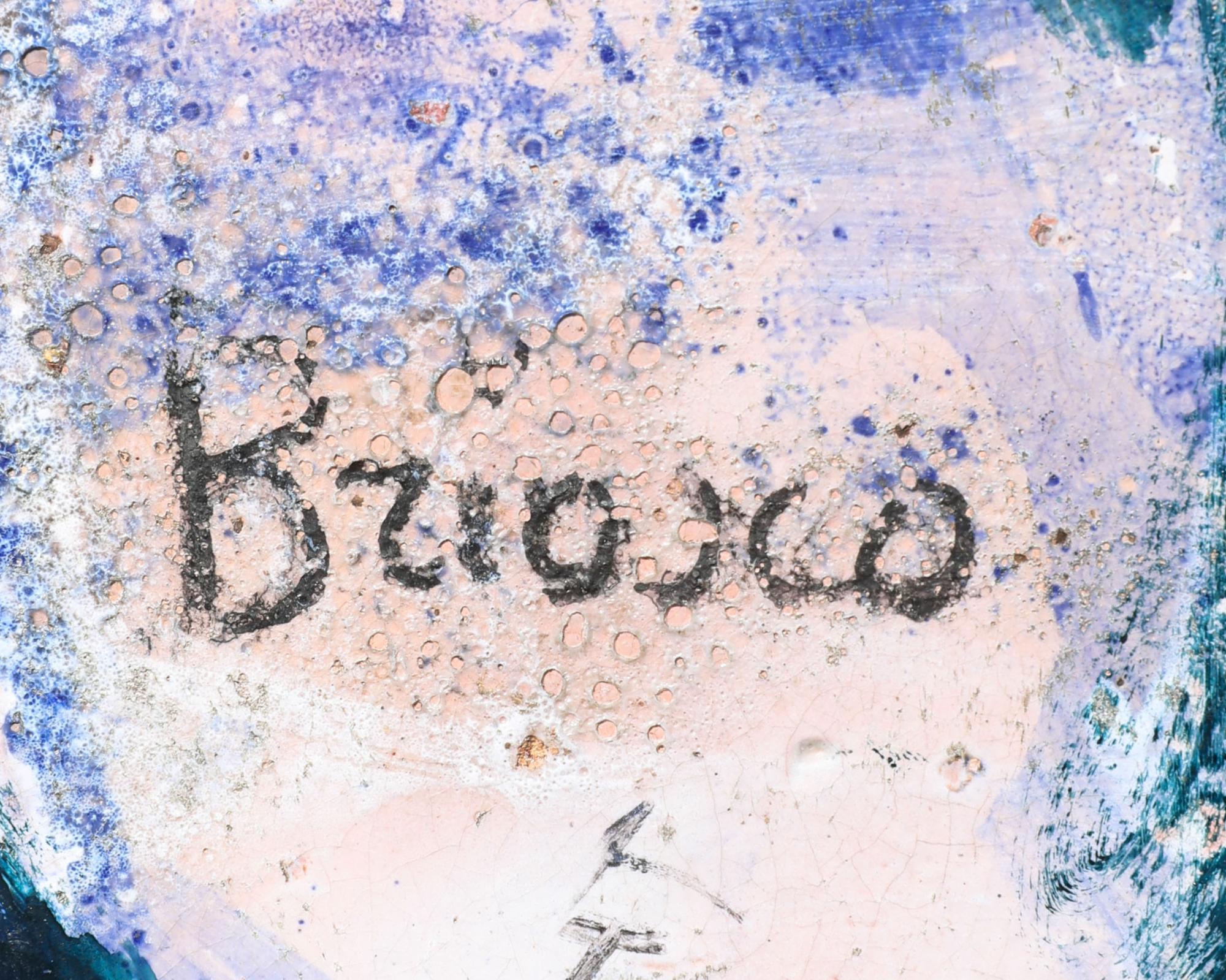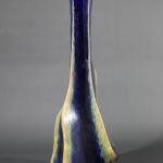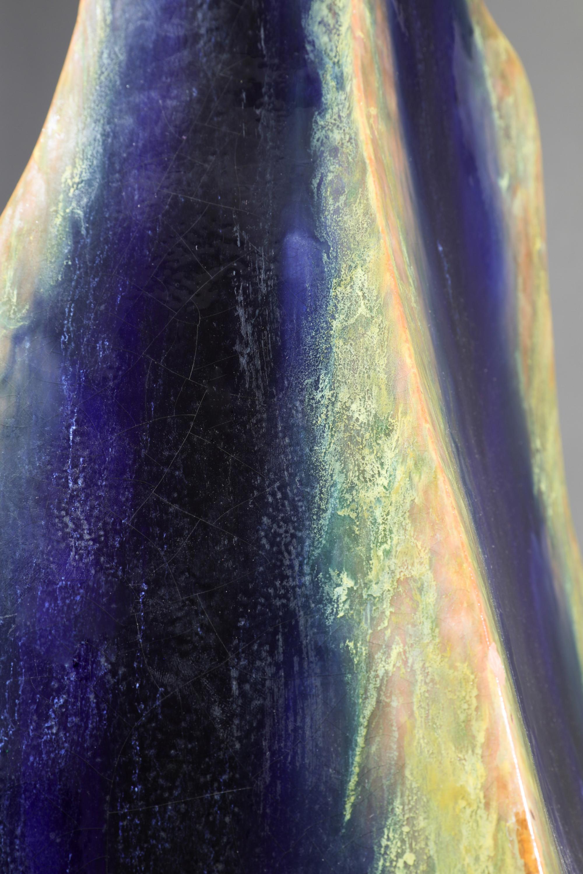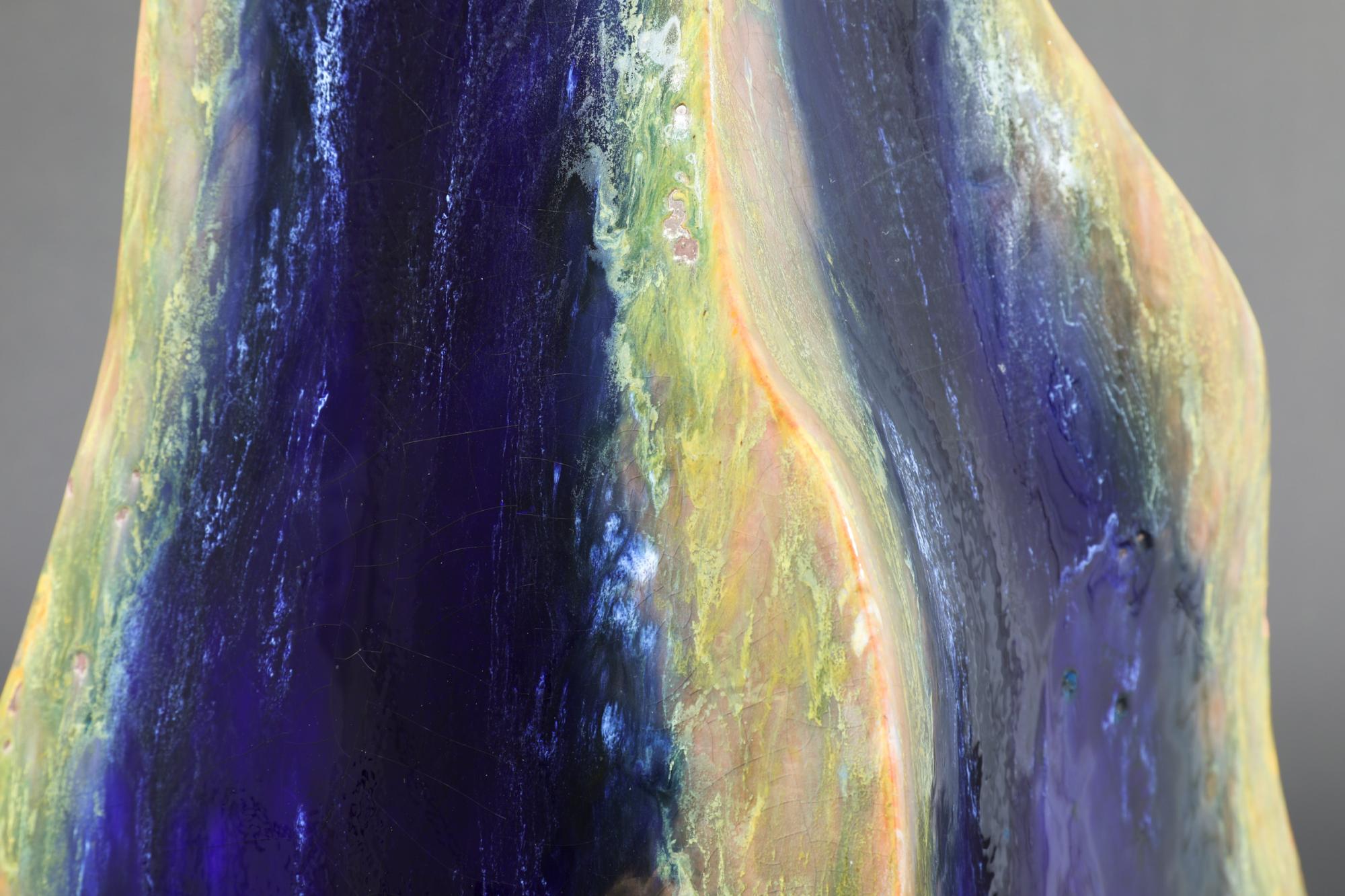 Floor vase. Stoneware. Irregularly four-sided, slightly bulbous form. Dark brown, yellow-green, and ochre-colored flowing glaze, coarse craquelure. H. 85 cm. Signed on the base: Briosco.
