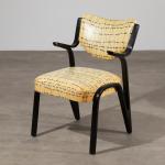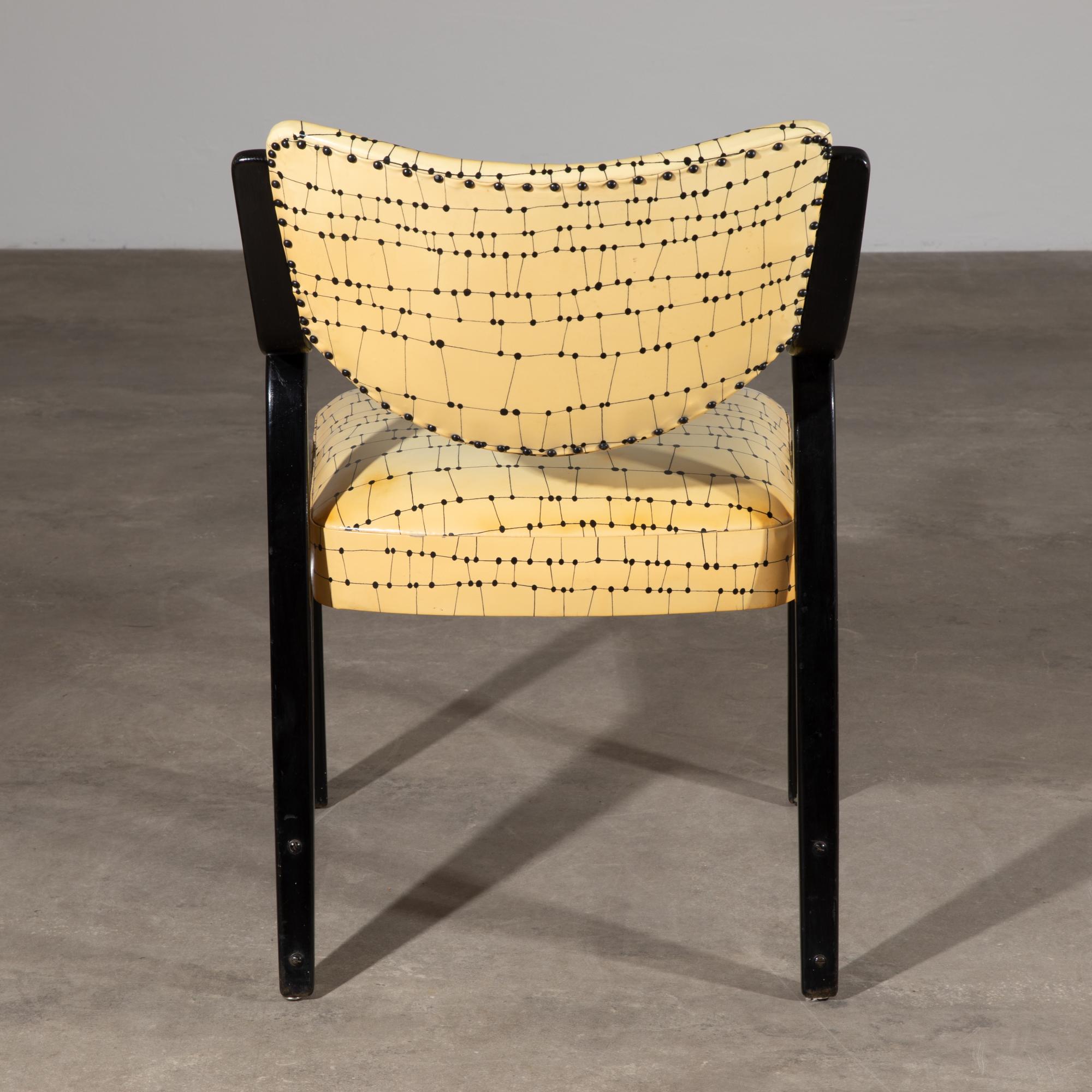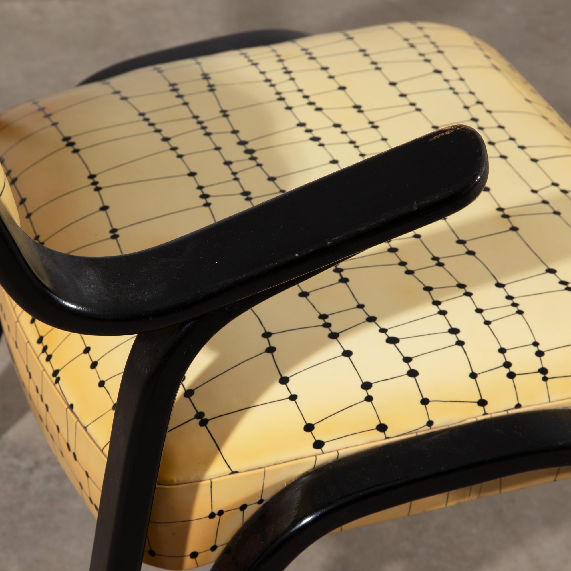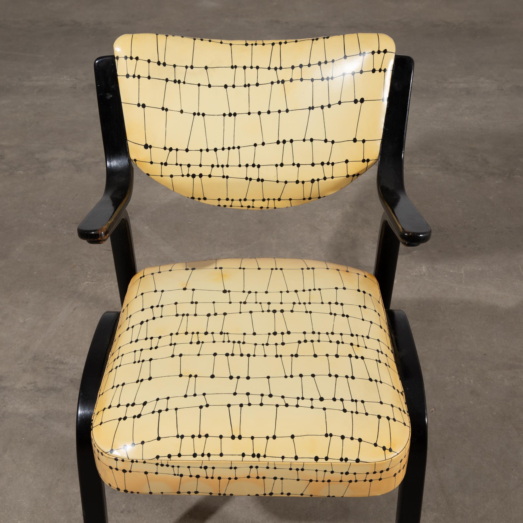Design from the 1950s. Manufactured by Fedrholz-Gesellschaft, Kassel. Black lacquered, curved plywood, patterned vinyl upholstery. 82 x 55 x 63 cm.