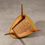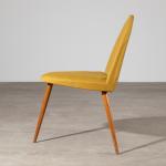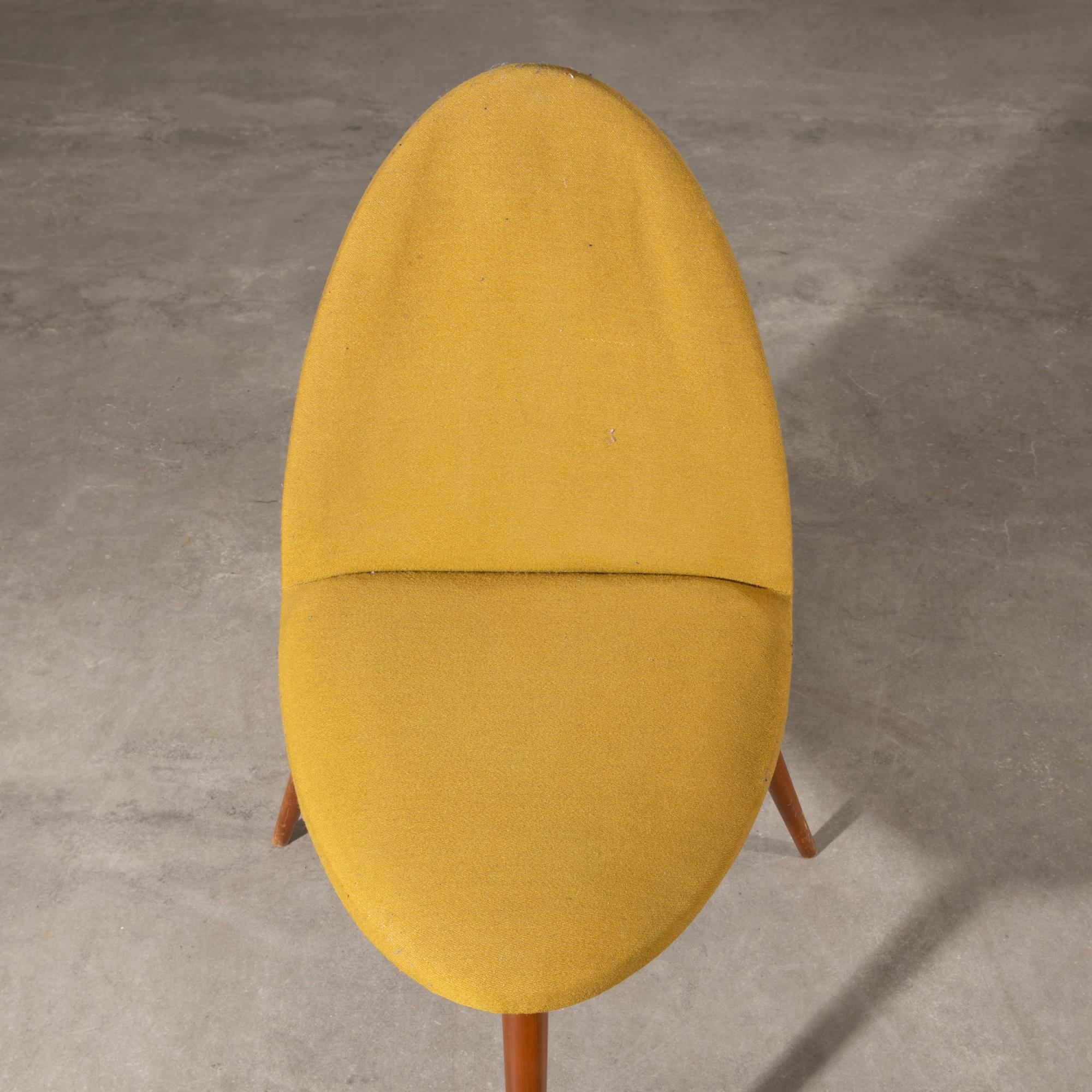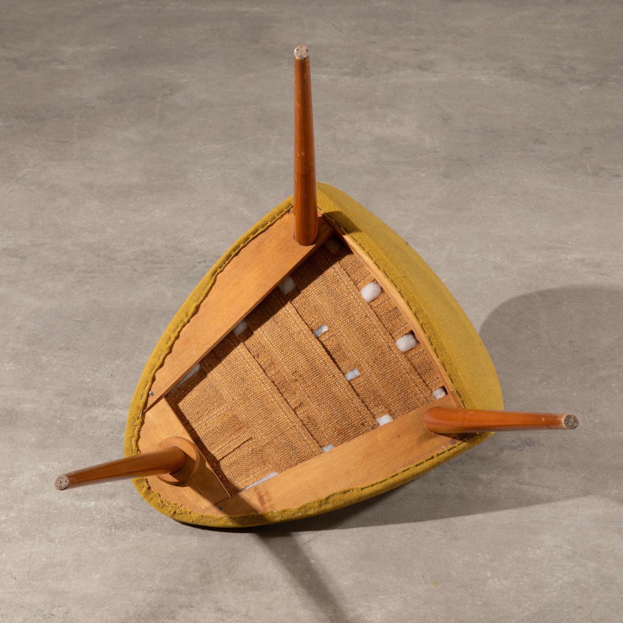 Designed and executed in the 1950s/60s, probably by Wilhelm Renz. Three-legged wooden construction with yellowish fabric upholstery. 81 x 56 x 63 cm.