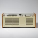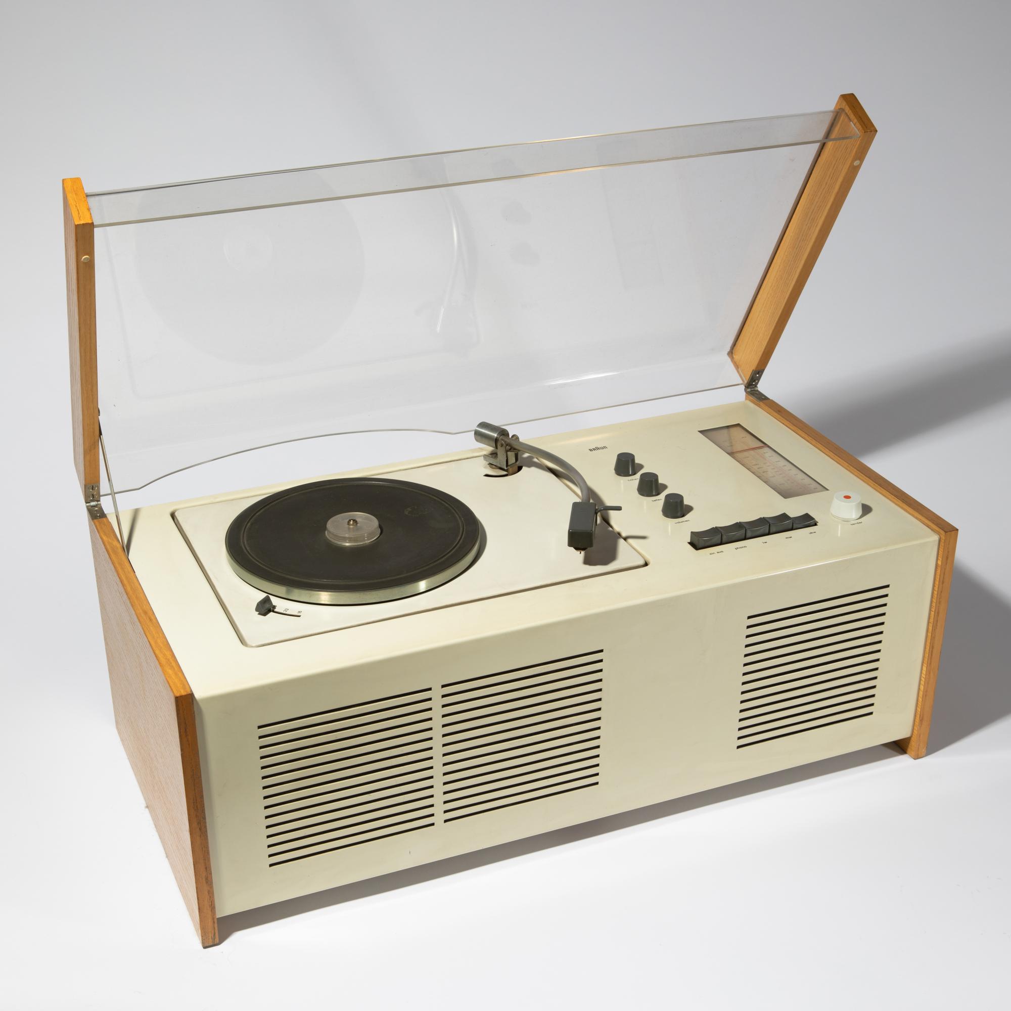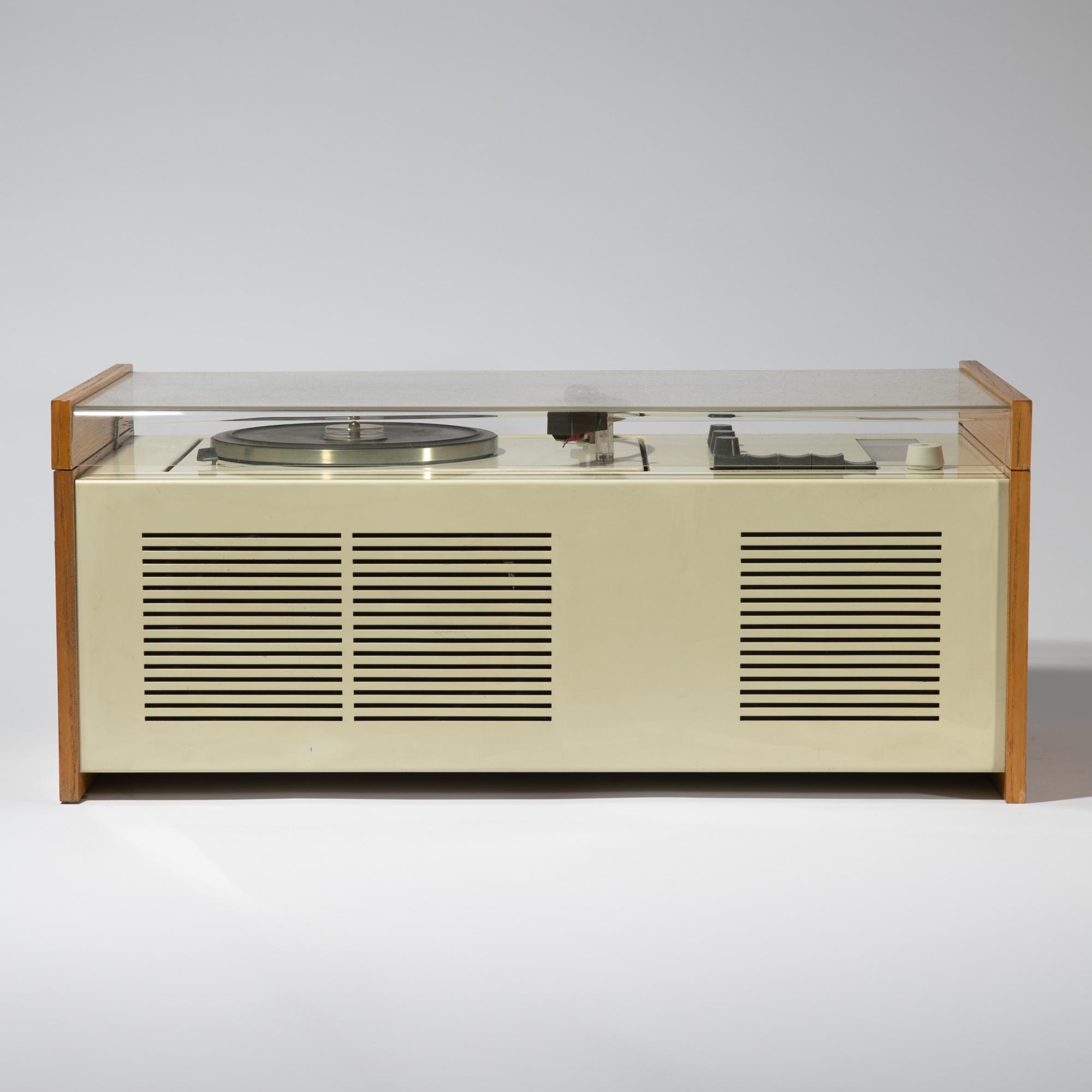 Designed in 1963. Manufactured by Braun AG. Wood, white and gray lacquered metal, acrylic. 24.5 x 58.5 x 29 cm. Marked several times.