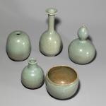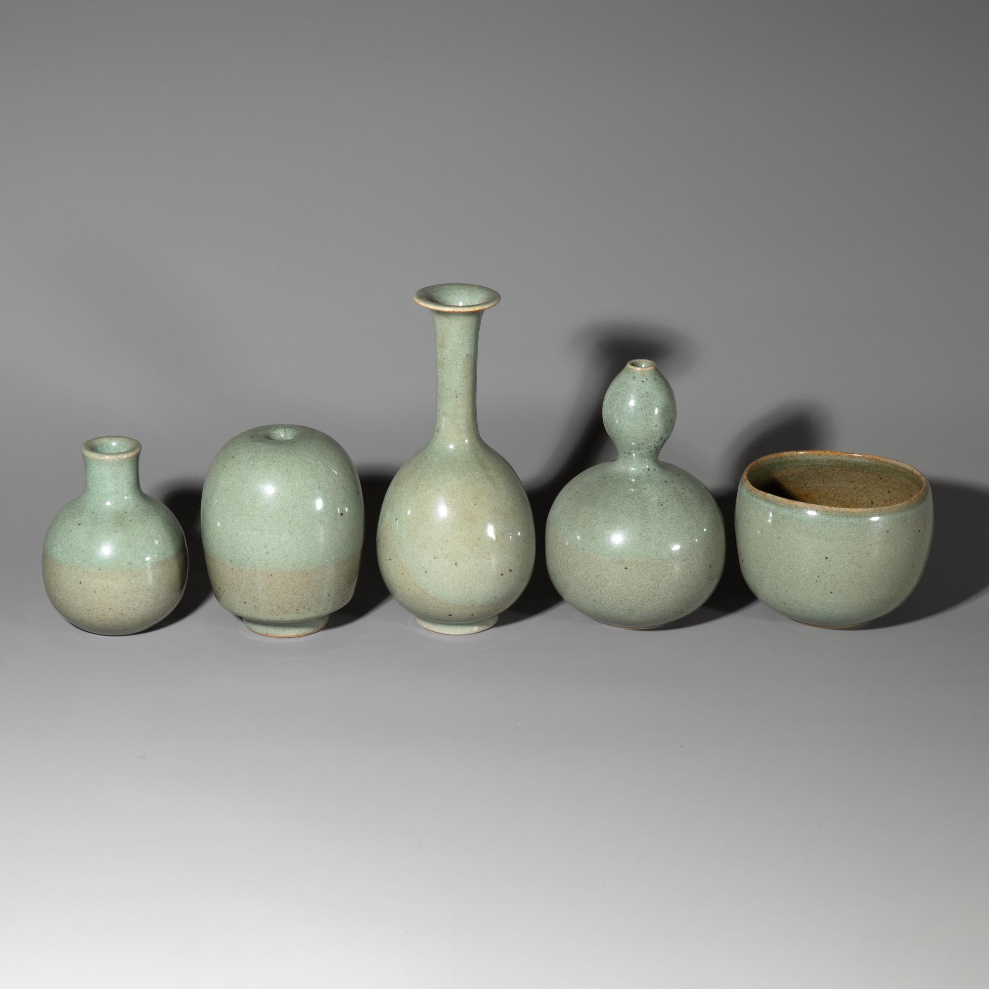 Glazed ceramic. Four vases and one bowl. H. 20 cm / H. 16 cm / H. 12 cm / H. 11.5 cm / H. 8.5 cm, D. 10.5 cm. Most marked on the underside with an artist's signature or workshop mark.