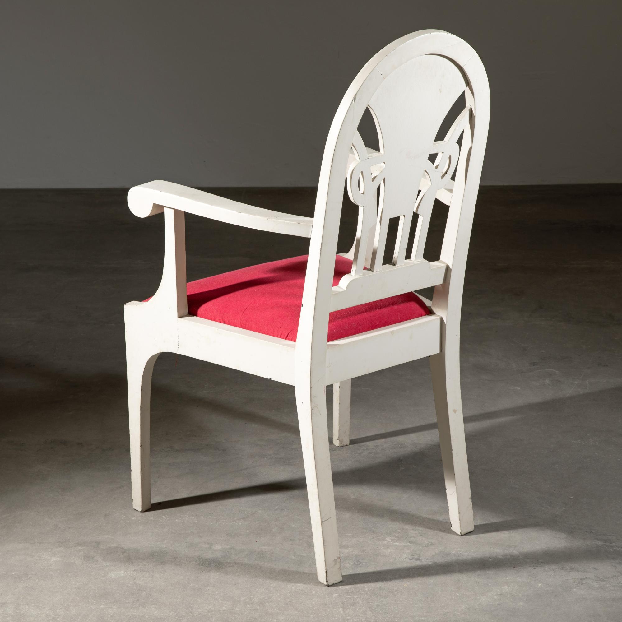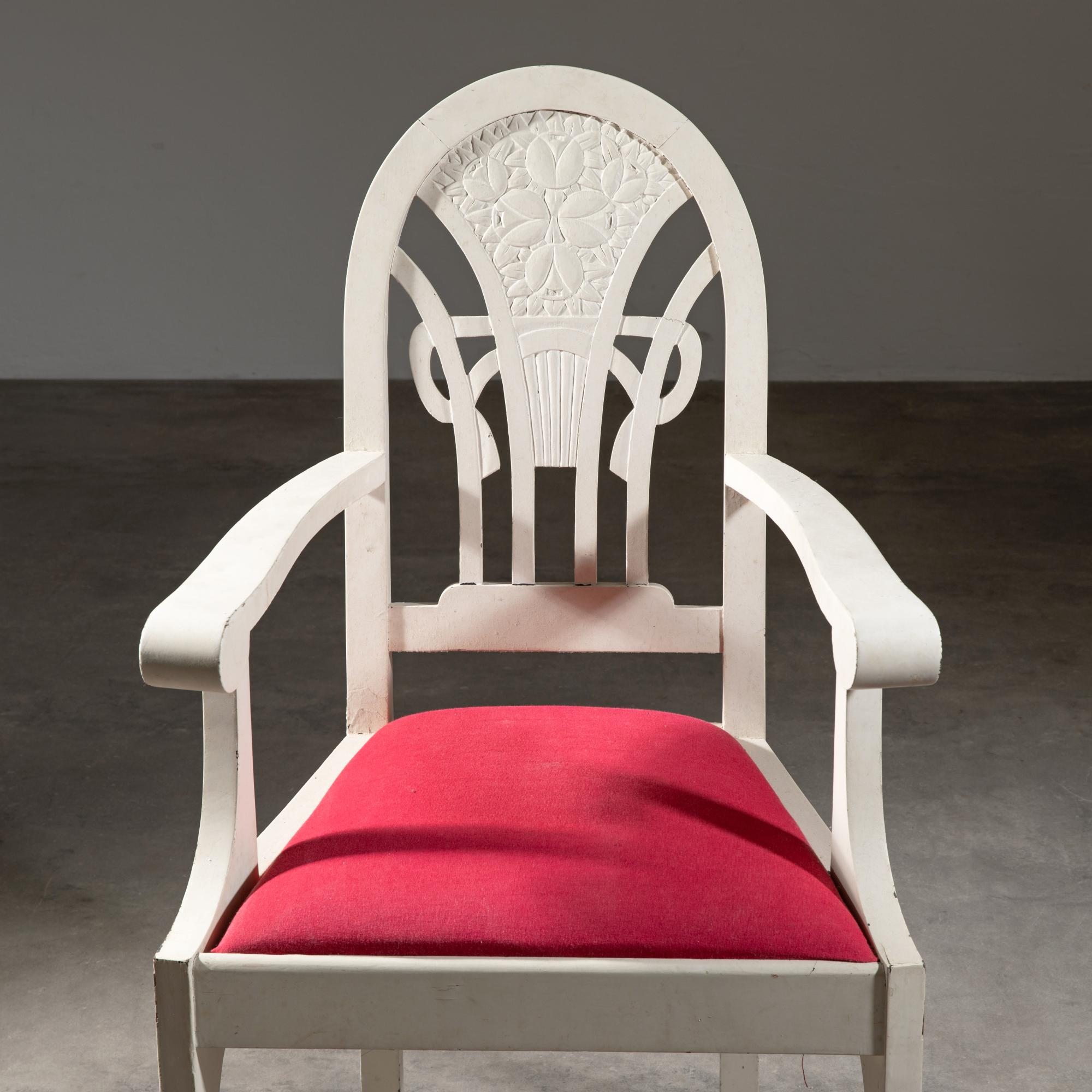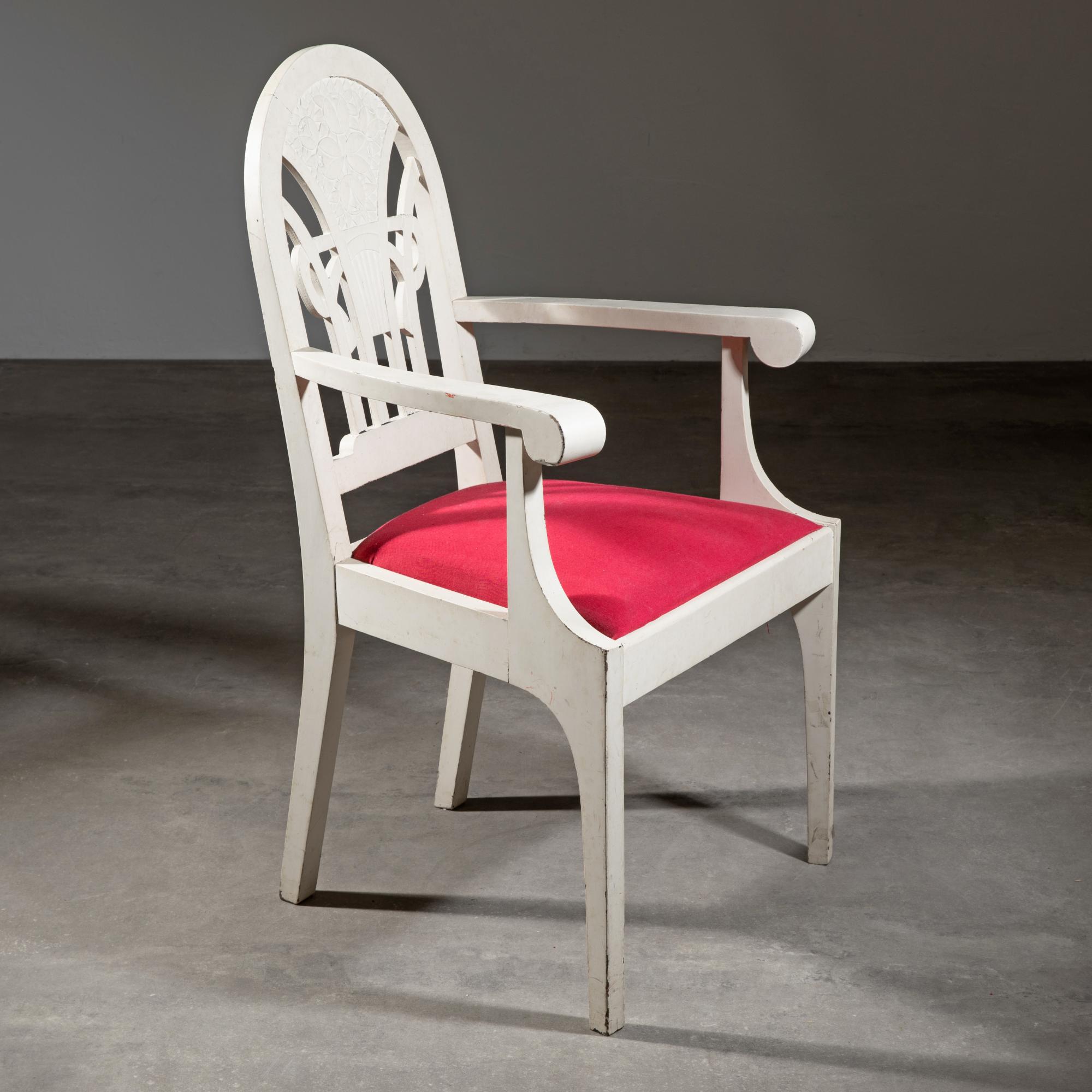 Designed around 1908. Oak, carved floral ornamentation in shallow relief, painted white. Upholstered in fabric. 103 x 58 x 51 cm.